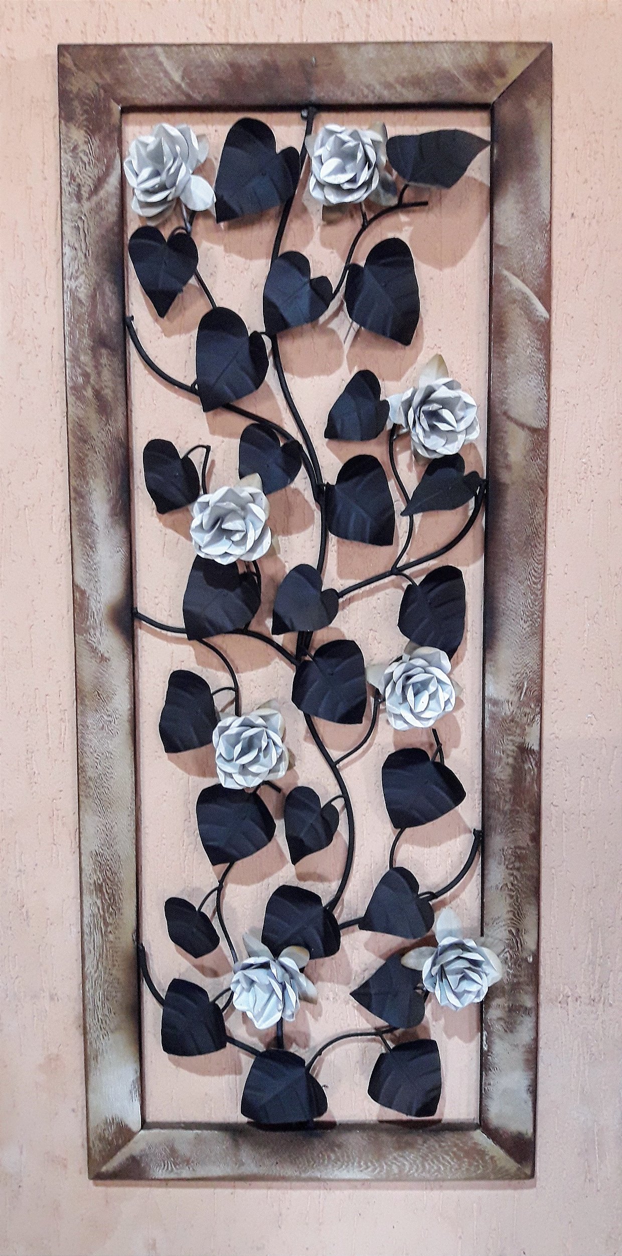 Os galhos são de ferro forjado e as flores e folhas são feitas em chapa de ferro. Os elementos são colocados de forma orgânica dando volume à peça formando um lindo efeito sombreado na parede.