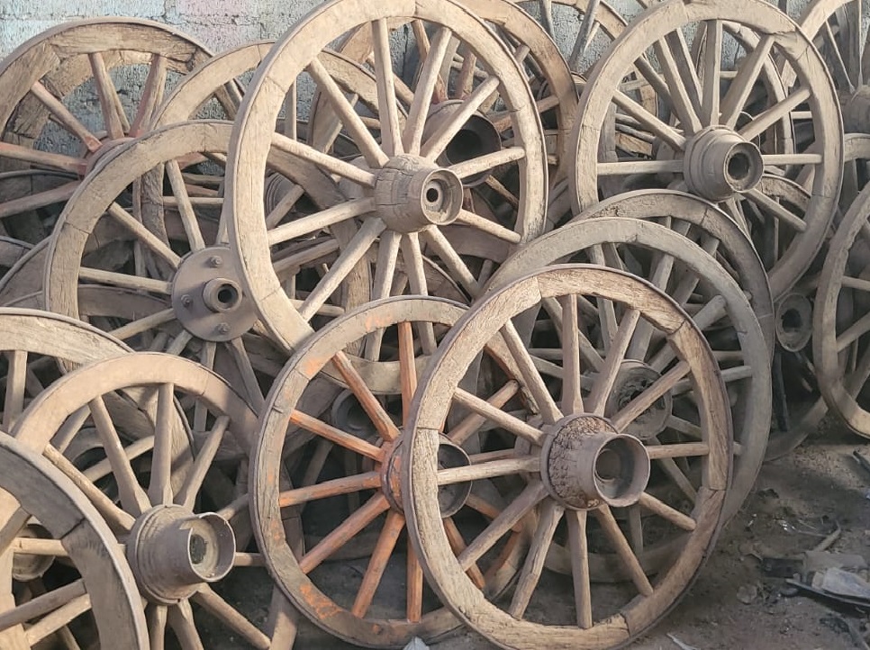As rodas de carroça são originais, feitas em ferro e madeira e proporcionam uma decoração rústica e criativa.